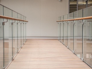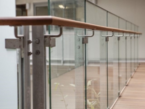 The glass was 17.52 toughened laminate grouted into a structural steel channel, with a stainless steel connecting hand rail passing through the glass.